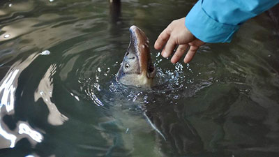 Осетровые рыбы, эти речные исполины, оказывается, по-детски тянутся к рукам и чавкают во время кормления