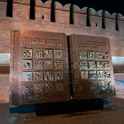 Эта огромная гранитная книга с бронзовыми «картинками» недавно появилась возле южной стены тульского кремля, чуть восточнее Башни Одоевских ворот.