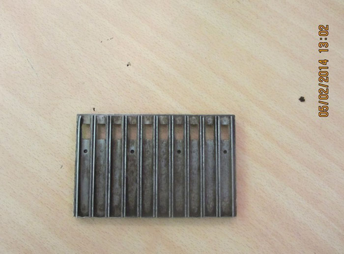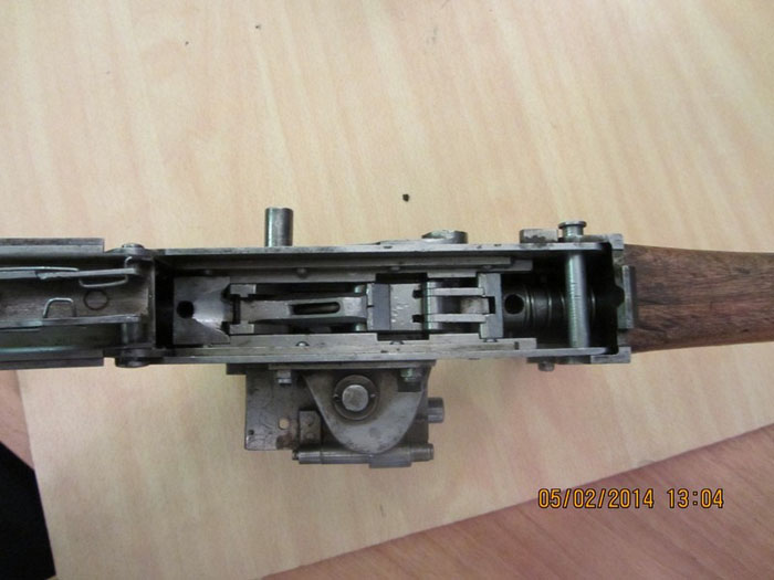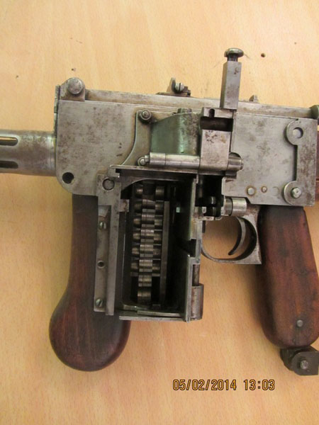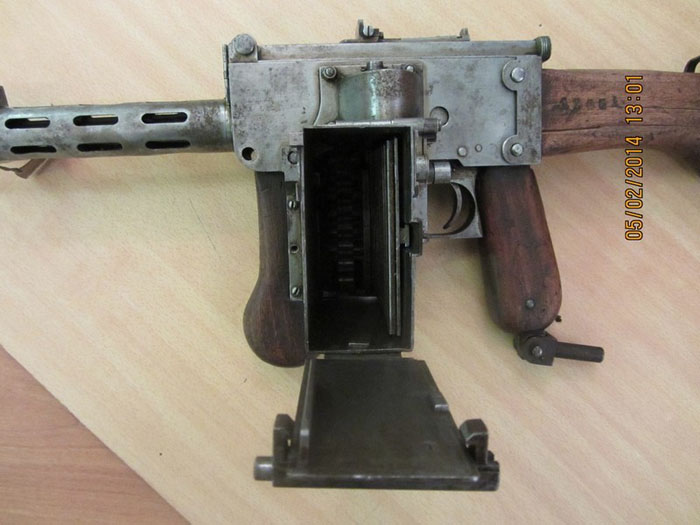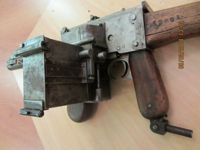Но особенно интересна у аппарата система питания. Он использует плоские пачки-обоймы, состоящие из 10 вертикальных рядов на 8 патронов каждый, вставляемые в короб, крепящийся слева к ствольной коробке. Специальный реечный механизм (похожий на использованный в японском пулемете Тип 11) после каждого выстрела сдвигает патроны в «рабочем» ряду обоймы вверх, на линию подачи, до их полного израсходования. После исчерпания ряда обойма автоматически продвигается на шаг вправо, выходя через дверцу в правой стенке ствольной коробки. остальное понятно по фото: