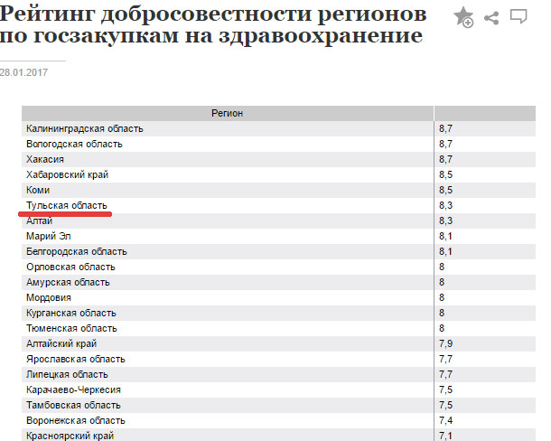 По итогам 2016 года первые три места по добросовестности с 8,7 балла из десяти возможных заняли три региона: Калининградская, Вологодская области и Хакасия.[У Тульской — вполне себе достойное шестое]rejtСамым недобросовестным регионом оказалась Новгородская область с 0,5 балла (перерасход — 18% из 438 млн руб. медицинских госконтрактов). На предпоследнем месте — Байконур (2 балла): перерасход 19% из 241 млн руб. Третьей с конца идет Архангельская область (2,2 балла), переплатившая 31% от 4,8 млрд руб. Особняком в самом конце стоит Чукотка, данные которой на сайте госзакупок вообще не позволяют определить, кто и что закупает.