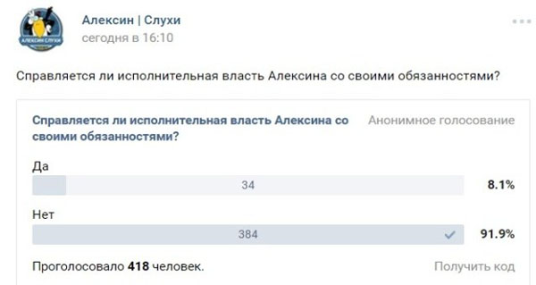 Тем временем, по информации «Тулы активной», в алексинской группе в соцсети организовали опрос о качестве работы исполнительной власти.