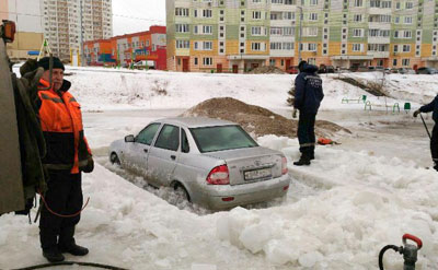 С конца января 2017 года во дворе новостройки на ул. Хворостухина, 33 стоял вмерзший в лед автомобиль. Под лед «Лада» уходила постепенно. То ли дело в коммунальной аварии, то ли в роднике, который течет неподалеку, – пока неизвестно.