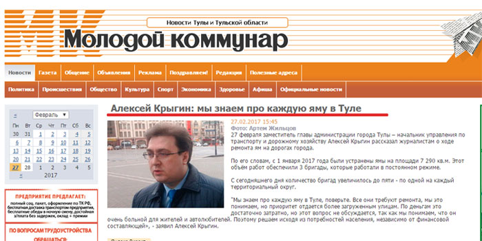 Как сообщает «Молодой коммунар», вчера, 27 февраля, чиновник заявил журналистам: «Мы знаем про каждую яму в Туле, поверьте. Все они требуют ремонта, мы это понимаем…»