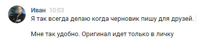 В личной переписке ВКонтакте господин Пантелеев пояснил: «Я так всегда делаю когда черновик пишу для друзей. Мне так удобно. Оригинал идет только в личку»