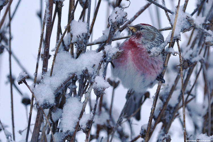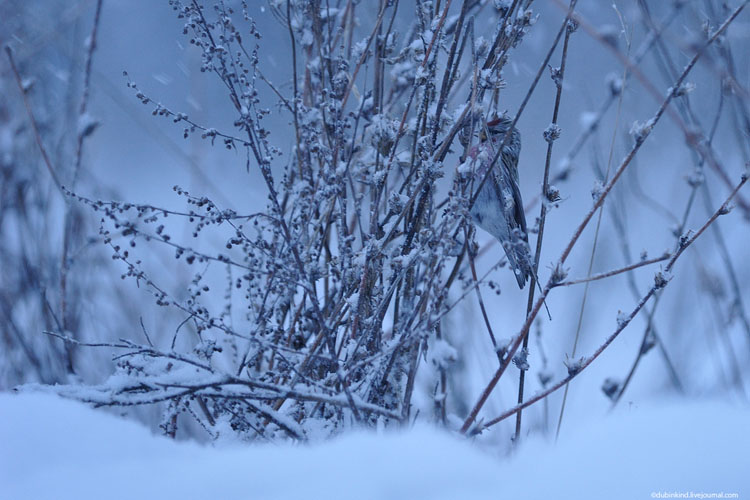 Просохнув после вчерашнего, рано утром, в половине седьмого, я направился к месту, где вчера купался видел горностая. Только я отошёл от домика, как повалил снег. Вскоре я встретил в поле одинокую чечётку