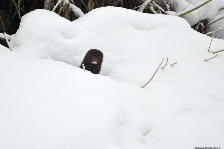 Не просидел я и часа в выбранном месте, как из сугроба на противоположном берегу показалась коричневая мордочка.