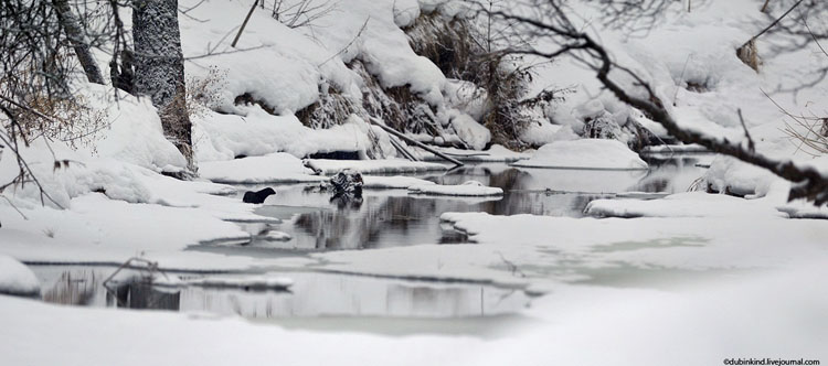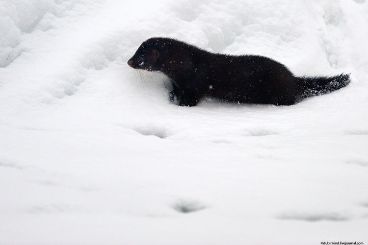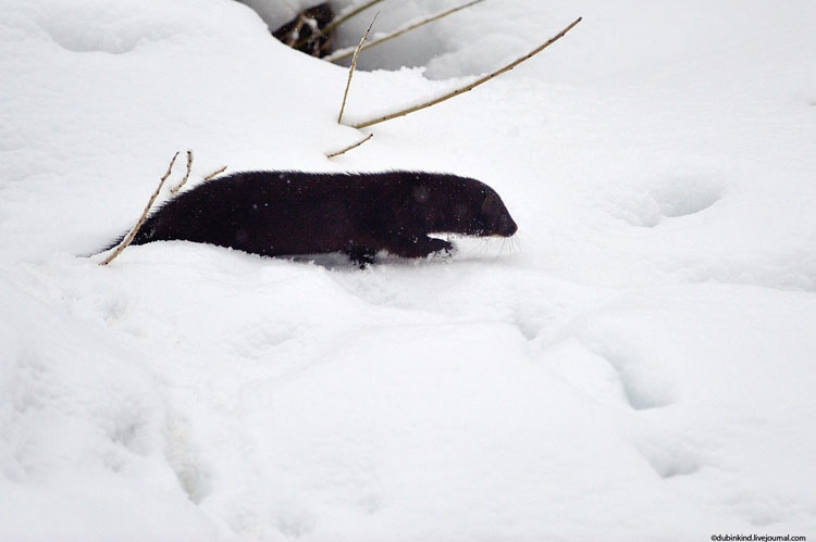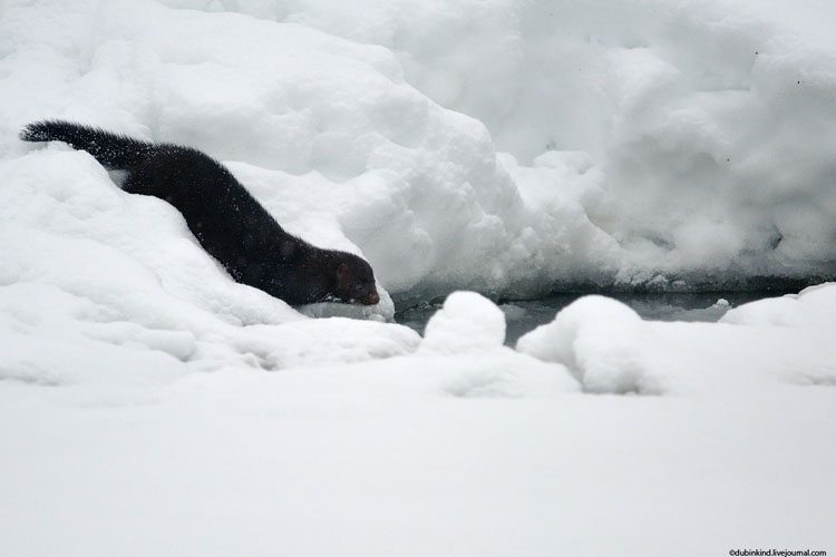 В конце концов он подошел как раз к той полынье, которую я вчера виртуозно пробил своей тушей, и нырнул. Я порадовался, что норка воспользовалась моей полыньёй, и я не зря мок в воде, но потом сообразил, что открытой воды кругом много, и не будь этой лунки, норка подошла бы ко мне гораздо ближе, а может быть, и попозировала подольше.