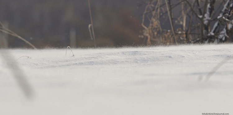 Ну вот, и до речки дотопал, и солнце стало изредка сквозь дымку пробиваться. Я устроился в сугробе примерно в 50м от места, где видел горностая. Здесь было больше следов и лучший обзор. Снег то переставал идти, то валил так, что не было ничего видно. Иногда в дальнем конце заводи расходились по воде круги и слышно было, что кто-то плавает. Я думал, что это бобры…