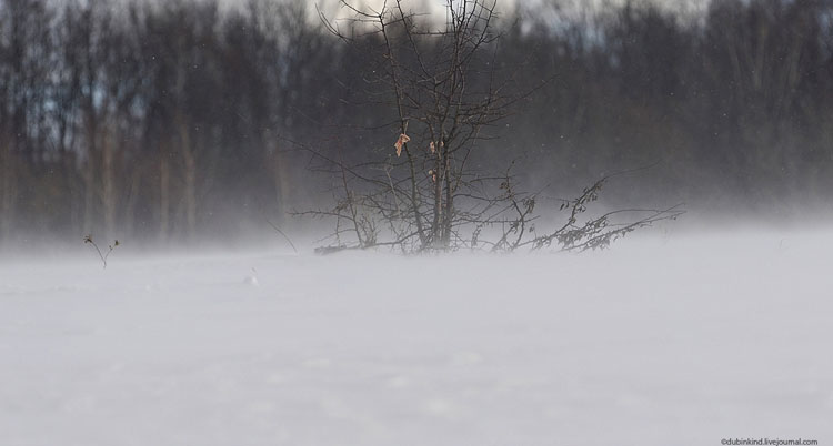 На лыжах я не дошёл даже до речки, сломалось крепление, и мне пришлось бросить их в сугроб, а на обратном пути подобрать. Правда, пришлось расстаться с мыслью идти на дальнее поле. Я решил установить засидку недалеко от того места, где спала лиса. Мясо и кости я положил недалеко от одинокого куста, а несколько кусочков развесил на ветки, для привлечения внимания. Ветер тем временем усилился.