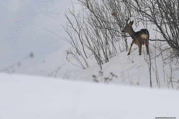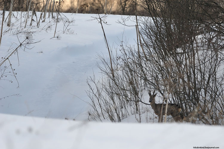 Когда стало темнеть и тень от засидки удлиннилась, я выбрался из неё, не без труда выдернул из снега и сложил снаряжение. На поле, со стороны заката мела красивая позёмка, и я, бросив рюкзак и фотоаппарат, прошёл чуть вперёд, чтобы снять её на видео. И тут же рухнул в снег. В овражке, метрах в трехстах от меня, кормилась ветками кустарников косуля. Я отругал себя за то, что оставил фотоаппарат и на четвереньках пополз за ним обратно. Бросил всё ненужное, взял только фотоаппарат на штативе и, пригнувшись, пошёл обратно