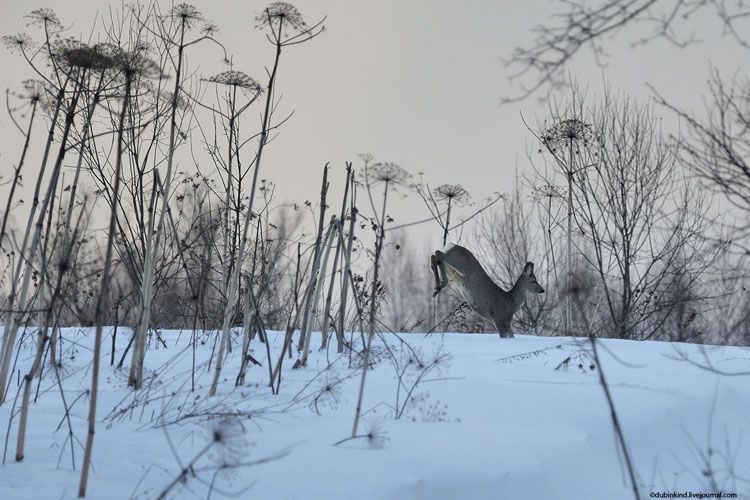 Первая и вторая умчались понизу в овражке, а та самая, что меня заметила, — поверху, глубоко проваливаясь в снег на прыжках. Преследовать я их не стал. Я так прыгать не умею, пока)