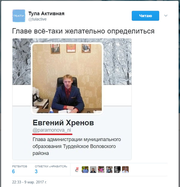 Забавное наблюдение сделали авторы «Тулы активной», разглядывая твиттер главы администрации муниципального образования Турдейское Воловского района. Если судить по фотографии, это явно мужчина. Судя по подписи — «Евгений Хренов» — тоже. Однако ник «@paramonova_ni» наводит на некоторые сомнения.