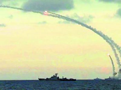 Боевой пуск крылатых ракет «Калибр» по позициям террористов из ИГИЛ