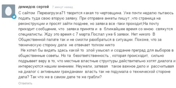 «С сайтом „Перезагрузка 71“ творится какая-то чертовщина. Уже почти неделю пытаюсь подать туда свою вторую заявку. При отправке анкеты пишут, что страница на реконструкции и просят зайти позднее, но заявка все-таки проходит. На почту приходит сообщение, что заявка принята и в ближайшее время со мною свяжутся специалисты.