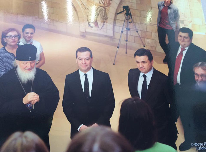 Сначала думал, ошибка. Уберут от греха подальше. Постесняются. Но нет же, висит до сих пор. В построенном гастарбайтерами за баснословные деньги, помпезно открытом и уже разваливающемся (каждый может приехать и убедиться) музейно-выставочном комплексе «Новый Иерусалим» ровно напротив гардероба торчит вот эта «икона».