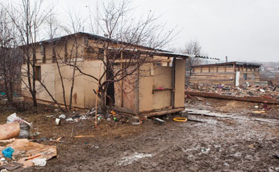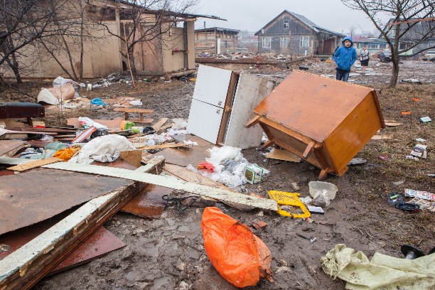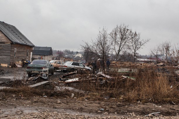Сразу в глаза бросаются еще не успевшие почернеть от дождей деревянные дома, аккурат рядом со снесенными. Отправленные к нам «делегаты» как могут отвлекают от новостроек внимание проблемой мусора и рассказами про КамАЗ.
