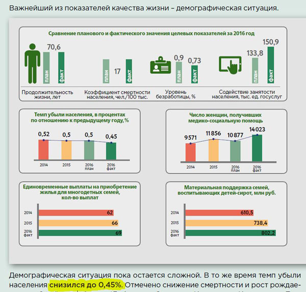 Но и здесь абсолютно ничего не сказано про существенное падение одного из главных целевых показателей – коэффициента рождаемости. Его в отчете среди целевых показателей вообще нет. Ничего не написали и про то, что естественная убыль населения за 2016 год выросла. Она составила 10243 человека, что на 243 человека больше, чем в 2015 году (10000 чел.).
