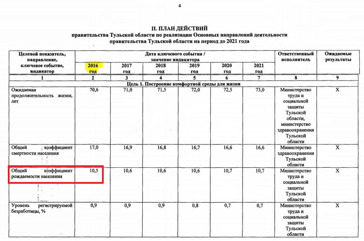 А коэффициент рождаемости за 2016 год составил всего 10,2, что гораздо ниже как запланированного показателя на 2016 год, так и достигнутого за 2015 год. Очень плохо, хотя понятно, что ни Дюмин, ни те его замы, которые только в 2016 году перебрались в Тулу, не могли существенно повлиять на рождаемость в прошлом году.