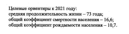 Нельзя сказать, что эта Программа была прорывной по всем направлениям, по демографии, например, намечалось лишь небольшое снижение естественной убыли населения за счет опять же небольшого роста рождаемости и снижения смертности. Тем не менее, улучшение демографической ситуации декларировалось одной из приоритетных задач и в Программе это направление деятельности правительства поставили на первое место. А в качестве целевых ориентиров были указаны: средняя продолжительность жизни, общий коэффициент смертности населения и общий коэффициент рождаемости (стр.13 Программы):