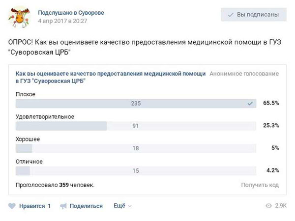 Но со временем, количество поступающих жалоб превысило все допустимые пределы. Поэтому, мы [«Деловой Суворов»] и решили посвятить этой теме отдельную статью. Сегодня, мы очень подробно рассмотрим ситуацию с здравоохранением в нашем районе и выясним наконец, в чём же кроется причина, столь многочисленных жалоб со стороны местных жителей. Итак, ни для кого не секрет, что в Суворовской ЦРБ отсутствует огромное количество врачей, как следствие, возмущенные люди вынуждены обращаться за медицинской помощью в областные больницы или частные (платные) клиники. На днях, в группе «Подслушано в Суворове«, социальной сети ВК, был опубликован опрос, призванный выяснить, как жители Суворова оценивают качество оказания медицинских услуг.