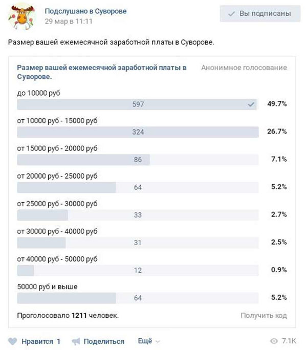 Это очень хорошая зарплата, я бы даже сказал, нереально хорошая для Суворова, особенно, если принять во внимание то, что согласно проводимому опросу в сообществе «Подслушано в Суворове» (от 29 марта 2017 года), около 70% респондентов имеют зарплаты от 8000 до 12000 рублей, и по сути, находятся за чертой бедности. Что самое интересное, данный опрос из группы пропал 2 апреля, причина удаления остается для нас загадкой. Но, наша журналистская практика показывает, подобные вещи, необходимо практически всегда скринить, что мы и успели сделать до удаления записи из группы!