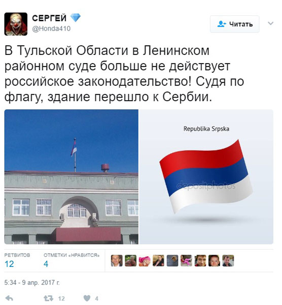 «В Тульской области в Ленинском районном суде больше не действует российское законодательство! Судя по флагу, здание перешло к Сербии», — пишет пользователь.