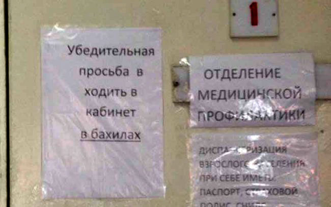 Ходим по этажам и кабинетам, практически на каждом вот такая надпись, что означает, Вы обязательно должны купить бахилы, иначе вас просто не впустят в кабинет.