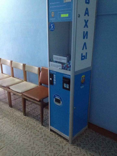 Переходим в отделение терапии, где располагается приемный покой! По традиции, посетителей прямо у входа встречает очередной аппарат по продаже бахил, с очень забавной табличкой: «Не засоряйте аппарат меньшим количеством монет». Забавно, мало того, что это уже уголовное дело, так еще и хватает совести, указывать пациентом какие монеты кидать, а какие нет…
