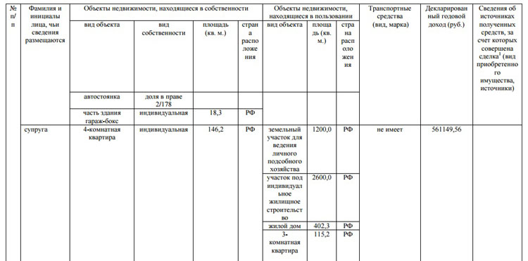 У супруги доходы значительно скромнее — всего 561 149,56 рублей за год. А также четырехкомнатная квартира.