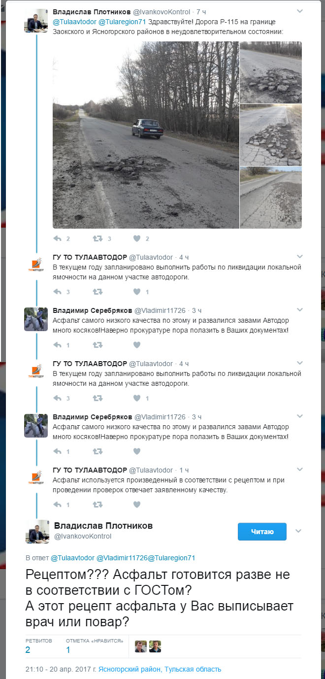 ГУ ТО «Тулаавтодор», однако, видит в этом «локальную ямочность». Слэнг дорожников, вообще восхитителен. Ремарка про рецепт, скорее всего, допустима в профессиональной среде. Это как если шахтёру скажут пригнать козу, он сразу поймёт, что речь о вагонетке без торцов, а не о парнокопытном четвероногом. Тех же, кто не занят дорогами и варкой асфальта, реплики про рецепт озадачивают.