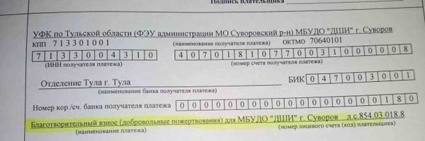 Здравствуйте, вот и не знаю к кому обратиться, хочу конечно остаться неизвестной т.к. в нашем районе, в лицо, можно сказать только если потом переехать в другой город. Так вот, моя проблема, у меня ребенок ходит в суворовскую ДШИ, и как то мы никогда не обращали внимания на квитанции которые нам выдавали за обучение, и платили вот уже 4 года, пока в этом году наши знакомые, когда решили бросить учиться и попросили пересчитать им платежи и вернуть то что осталось т.к. оплатили весь год на минуточку 5000 руб. А отходили месяц им ответили что они могут и не платить это мол все добровольно. Я когда узнала, просмотрела квитанцию и действительно, в наименовании платежа указано: благотворительные взносы добровольное пожертвование.