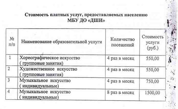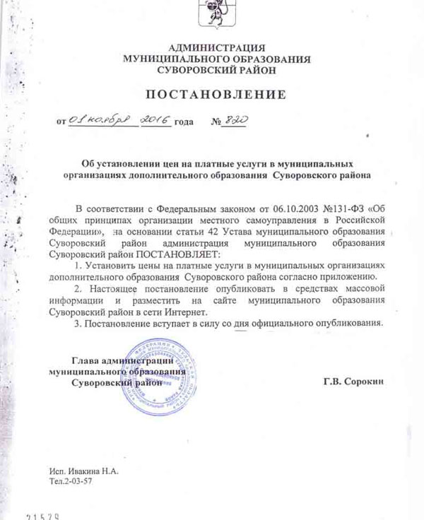 Есть так же и «постановление об установлении цен на платные услуги в муниципальных организациях дополнительного образования Суворовского района«.