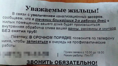 Теперь вот очередь до унитазов дошла. Придет мужик (может, даже в красивой спецовке), изобразит рвение, засунет в слив трос. Две минуты ненужных манипуляций — половина стариковской пенсии. Рентабельность, как на золотом прииске. К слову, дозвониться по номеру, указанному в объявлении, нам не удалось. Мы пробили его в интернете — там он значится как телефон для заказа суши. Логично: от японской еды до канализации дистанция, в общем-то, небольшая.