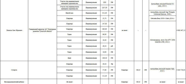 Генеральный директор АО «Корпорация развития Тульской области» Олег Липатов задекларировал два участка, жилой дом, три квартиры, четыре гаража и баню. Доход Липатова в 2016 году — 6 892 467,13 рублей.