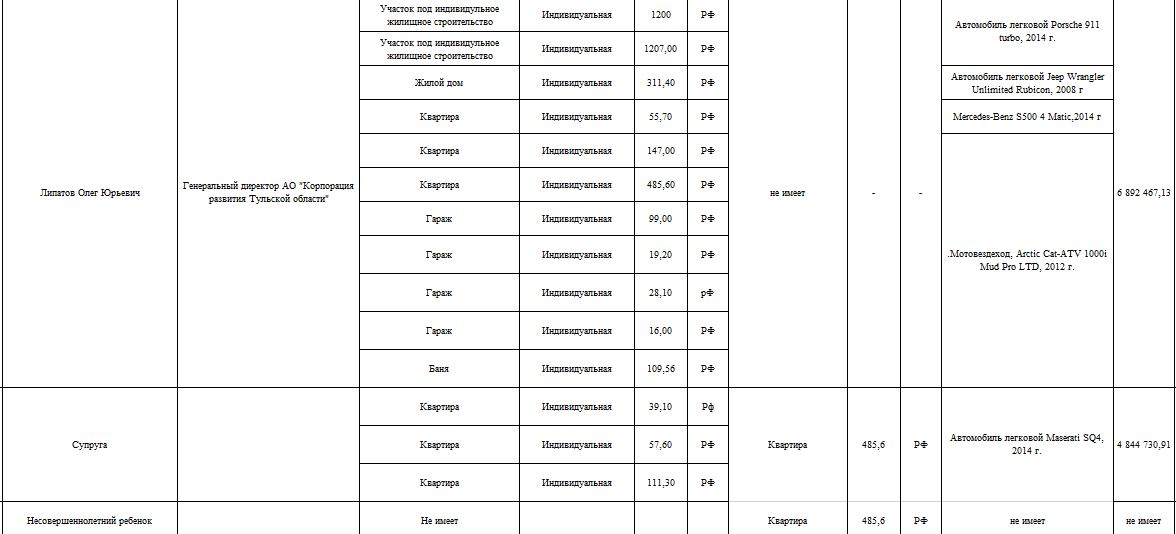 Как стало известно ИА «Тульская пресса», среди имущества супруги Липатова, чей доход за год составил 4844730,91 рублей — иномарка Maserati SQ4.