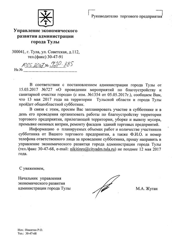 Придя сегодня на работу (работаю я в магазине) и открыв электронку, обнаружил там письмо от администрации, отправлено с адреса kapelyhaem@cityadm.tula.ru Людмилой Капелюхой. Содержание письма следующее: