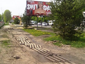 Лицо капиталистической России: деревянный тротуар как в древнем Новгороде, забор от Советской власти, свое — только билборд с сисястой девкой.