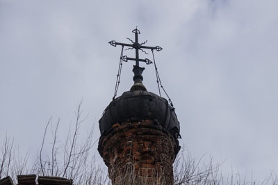 Храм закрыт на замок. Внутри через щели в дверях и окнах, видно частично восстановленный иконостас. А вот колокольня похоже доживает свои последние дни.