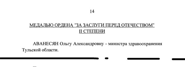 В марте губернатор области  отправил в отставку руководителя областной медицины Ольгу Аванесян (на фото).  Фактически это  было сделано руками министра здравоохранения РФ Вероники Скворцовой, которая  в присутствии  нескольких сот врачей заявила, что в Тульском здравоохранении сидят люди, «занимающиеся приписками», которые «обманывают страну и ее руководителей». Заметьте, даже не руководителей области.