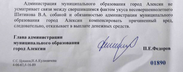 После укуса собаки Алексей обращался к алексинским чиновникам, чтобы они добровольно возместили ущерб. В ответ ему сообщили, что администрация МО город Алексин не усматривает связи между свершившимся фактом укуса ребенка собакой и обязанностью администрации компенсировать причиненный вред.