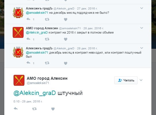 – Но самое главное, что буквально за несколько дней до случившегося я в сети Twitter официально обращался с заявлением к администрации муниципального образования город Алексин по поводу угрозы бродячих собак. Последний раз сообщил конкретно, что они собираются в заброшенном здании и нападают на людей, – говорит Шитиков. – На что мне ответили, что конкурс на отлов собак закончился в декабре 2016 года и теперь отлавливать бродячих собак будут только после проведения конкурса на нового подрядчика. Как выяснилось далее договор был заключен с подрядчиком ООО «Велес» только с 6 февраля 2017 года. Соответственно, мероприятий по отлову безнадзорных животных до этого момента не производилось.