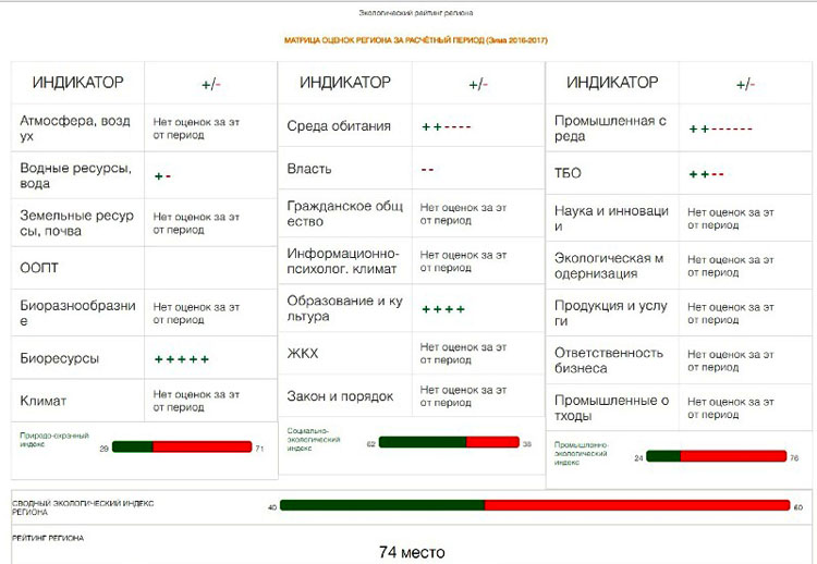 Он был составлен на основе анализа состояния атмосферного воздуха, воды, объёмов сбросов и выбросов, а также уровня ответственности местных властей, активности общественных организаций и других показателей.