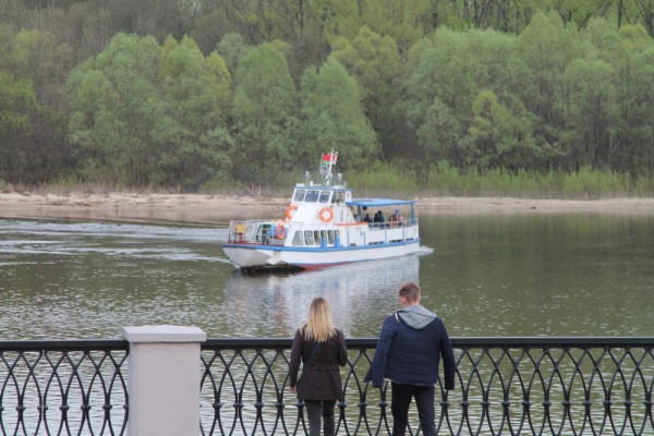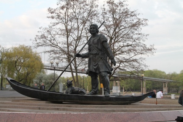 Прям у Киевского спуска мужик в лодке и с рысью. Рысь — это символ города, на гербе у них. Кстати, на заднем фоне — ПЕШЕХОДНЫЙ мост через реку Сож. А у нас не могут вторую очередь автомобильного моста через Упу на Восточном обводе сделать (Лавров.jpg).