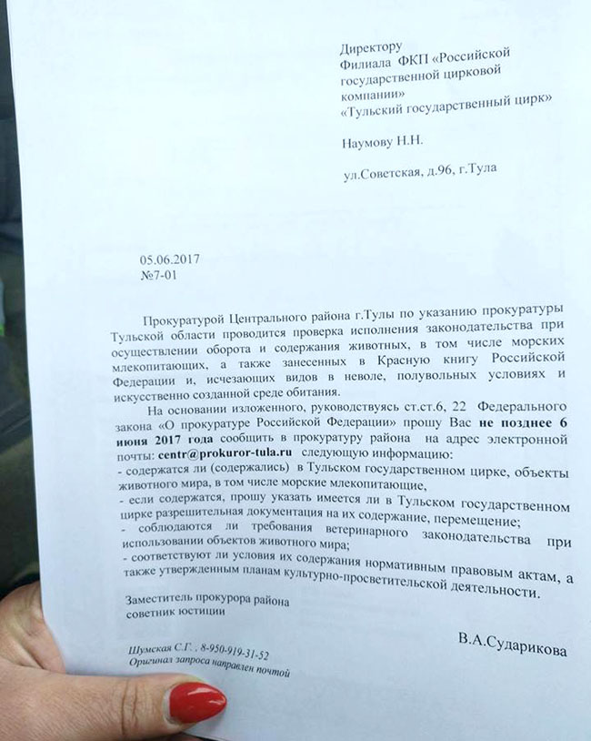 Прокуратурой Центрального района г.Тулы по указанию прокуратуры Тульской области проводится проверка исполнения законодательства при овеществлении оборота и содержания животных, в том числе морских млекопитающих, а также занесенных в Красную книгу Российской федерации и, исчезающих видов в неволе, полувольных условиях и искусственно созданной среде обитания.