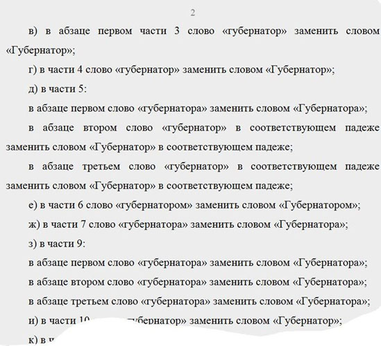 Так, вместе с Уставом депутаты приняли областные законы №2305-ЗТО и №2306-ЗТО. В первом законе, принятом в один день с Уставом, более 40 поправок связаны с заменой маленькой буквы в слове «губернатор» на большую и всего несколько поправок связано с другими изменениями. Большая часть изменений, включенных во второй закон – это также замена слова «губернатор» в соответствующем падеже словом «Губернатор».