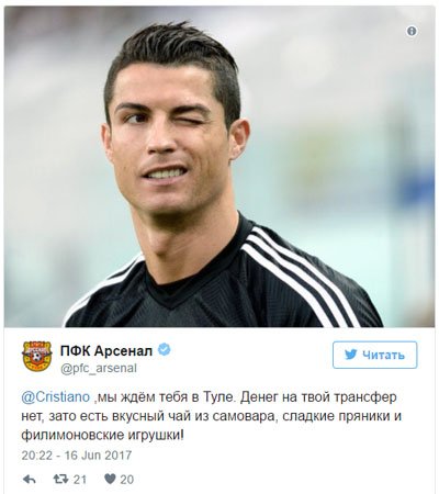– Криштиану Роналду, мы ждем тебя в Туле, – гласит запись на странице в социальной сети клуба. – Денег на твой трансфер нет, зато есть вкусный чай из самовара, сладкие пряники и филимоновские игрушки!