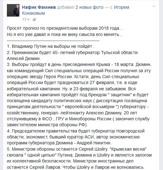 Такой политический прогноз на следующий год Фамиев опубликовал на своей странице в социальной сети Facebook.