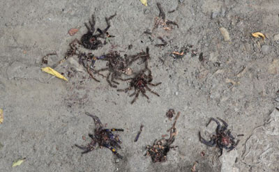 26 июня на ул. Одоевское шоссе, 77 в Туле были обнаружены восемь раздавленных пауков-птицеедов. Членистоногие находились на парковке продуктовой оптовой базы. Все пауки были в одном месте, поэтому сложилось впечатление, что от них намеренно хотели избавиться и задавили колесами машины.