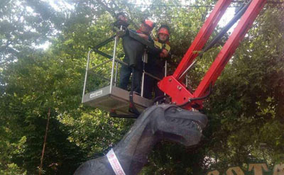 1 июля в Центр гражданской защиты и спасательных работ около 15.30 сообщили, что прямо над тульской «тещей» — всем известным динозавром, стоящим возле зооэкзотариума — сломался тополь. Обломившаяся ветка повисла на проводах над самым памятником.