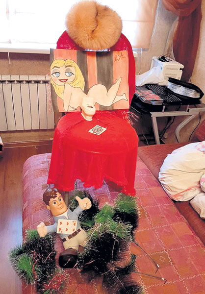 — Если бы. Как-то я зашла в нашу тульскую квартиру и увидела инсталляцию: на столе стоит стул, на нем мой пеньюар, мой нарисованный дочерью портрет, внизу — кукла с пробитой головой в еловых ветках и две карты — у куклы шестерка червей, а у меня крестовая дама. Я очень испугалась, почувствовала себя персонажем фильма ужасов. Потом мне Олег прислал SMS: «Видела инсталляцию?» По-моему, у него началась паранойя.
